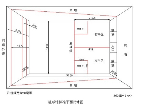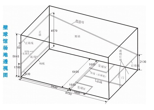 一、 場地標準(國際標準競賽場地) 寬6.4米,長9.75米,前高4.57米,后高2.13米,天花高度5~6米,響板高度0.48米,正面發球線高度1.83米,地面發球線距后墻4.26米,半場線將地面發球線與后墻從中心向左右平分,發球區為1.6米見方。